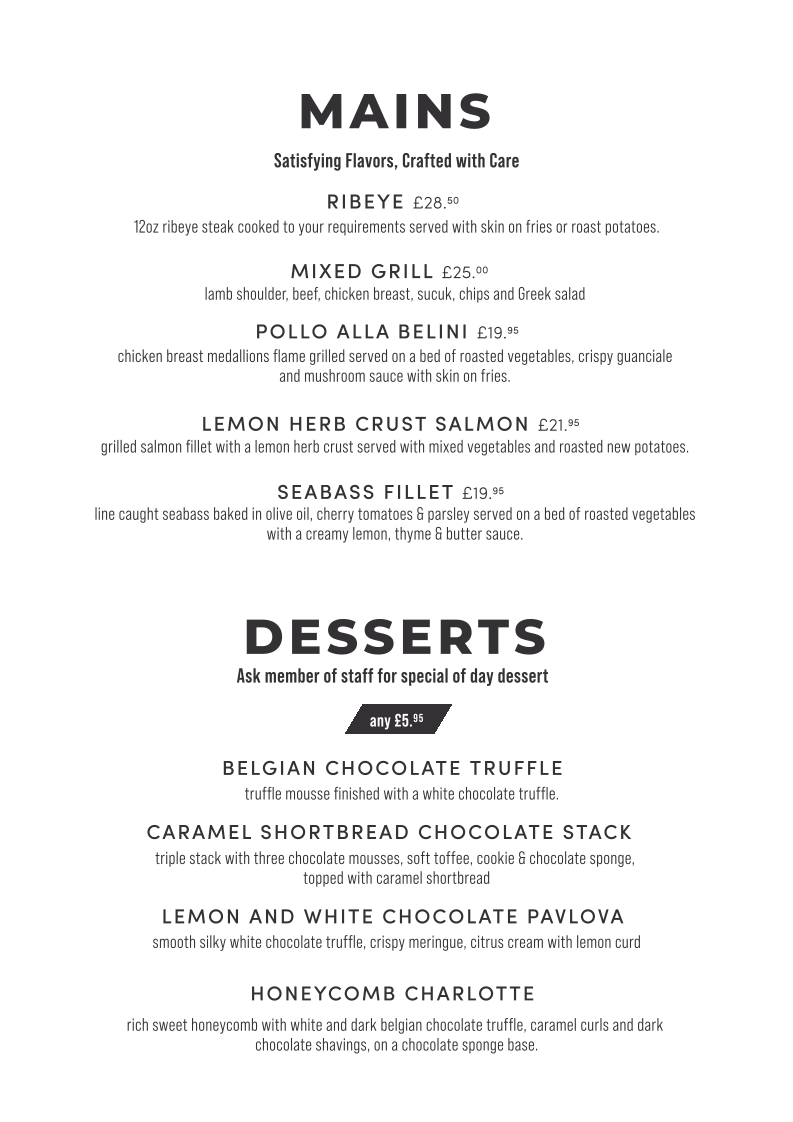 The menu is thoughtfully curated, offering a versatile selection that caters to varied palates without overwhelming with excess. Diners can expect Mediterranean-inspired starters such as grilled halloumi or bruschetta, alongside hearty mains like pan-seared sea bass, lamb cutlets, and truffle mushroom risotto. A standout from our visit was the slow-cooked beef short rib-tender, deeply flavorful, and plated with finesse. Vegetarian and vegan options are present but could be more diverse; however, dietary accommodations are welcomed and executed with care.